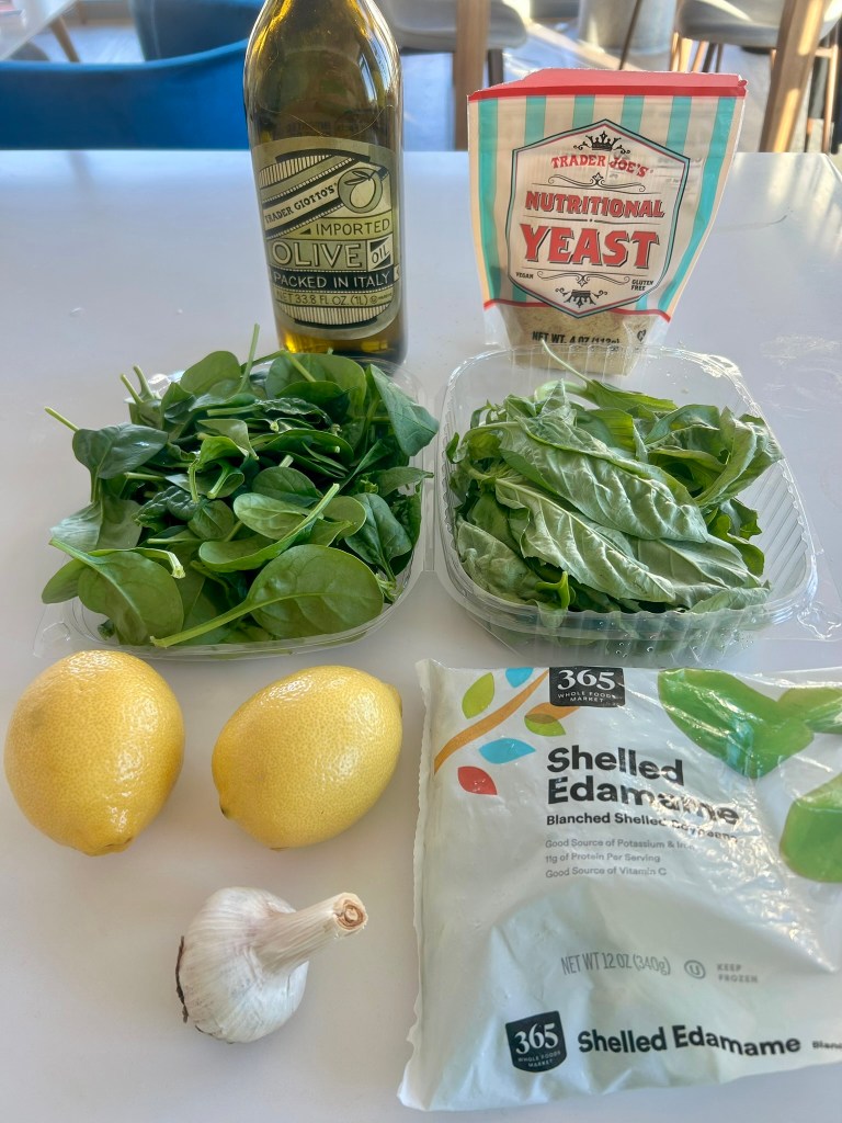 - Blend the pesto Blend the spinach, basil, edamame, garlic, nutritional yeast, and olive oil in a blender or food processor. Add vegetable broth, pasta water, or olive oil to reach desired consistency.