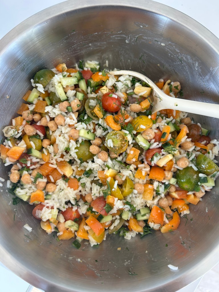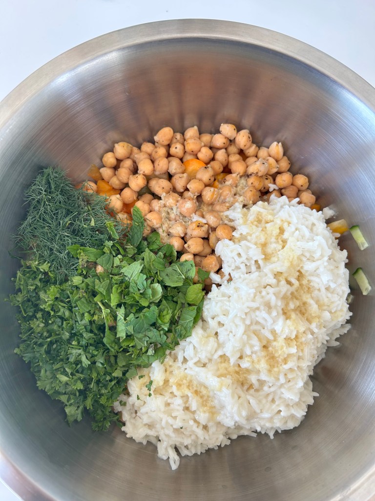 This rainbow chickpea salad is my go-to for a fresh, filling, and flavorful meal. Packed with protein-rich chickpeas, hydrating veggies, and fragrant herbs, it’s both delicious and nutrient-dense. The combination of tomatoes, bell peppers, and cucumbers provides vitamins A, C, and K, while chickpeas and rice offer fiber and plant-based protein to keep you energized and satisfied.